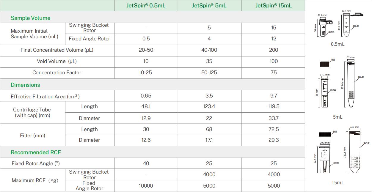 Molecular weight cutoff(MWCO) identification and volume graduation are etched on the side of the filter for easy identification and analysis