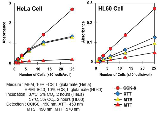 HeLa cells were incubated with WST-8 (CCK-8), WST-1, or MTS at 24 hours from addition of those reagents.